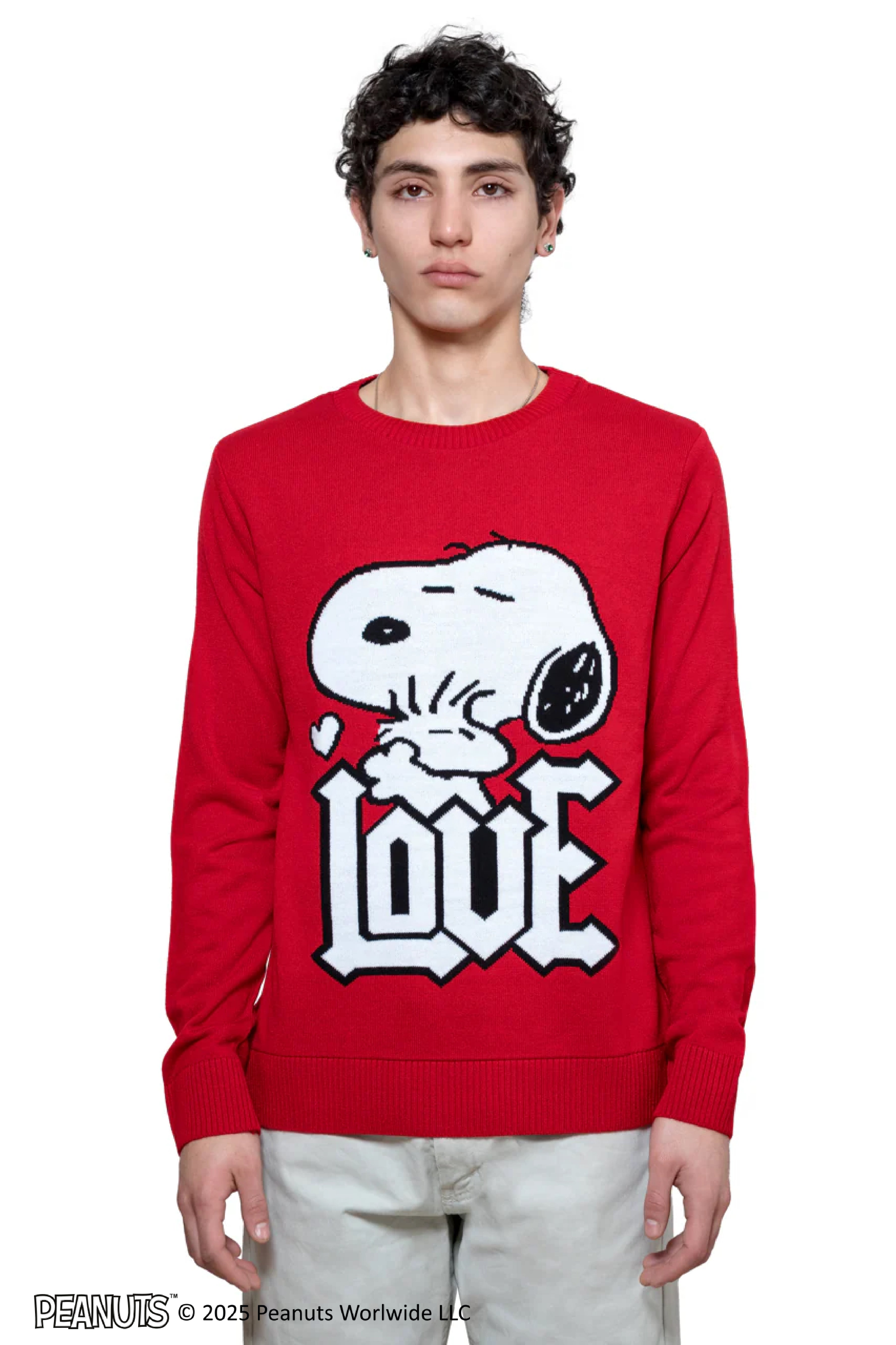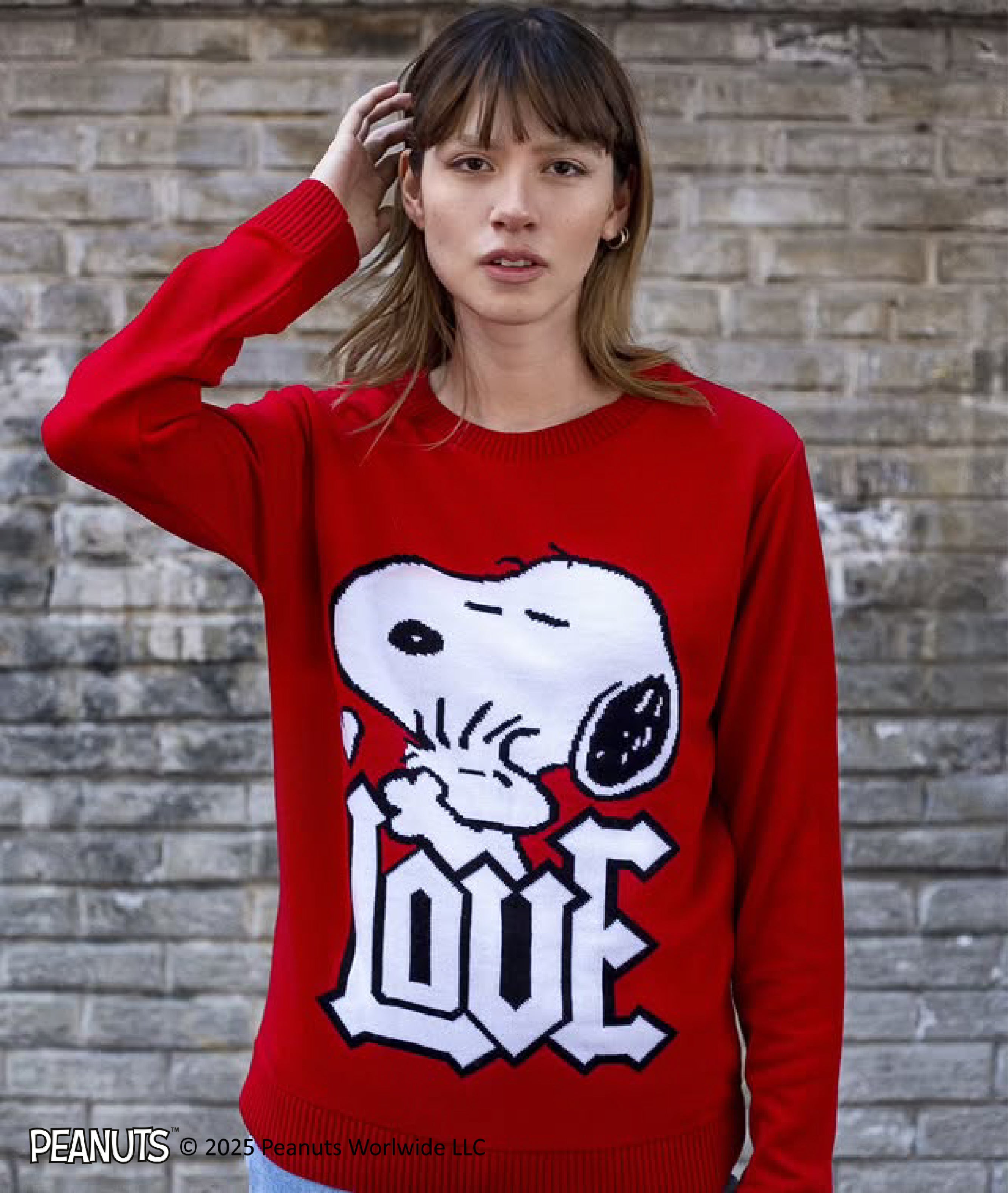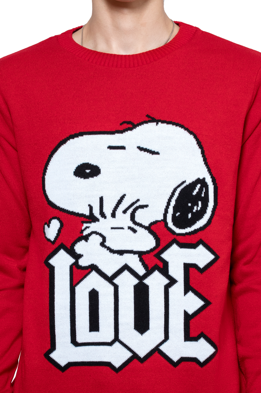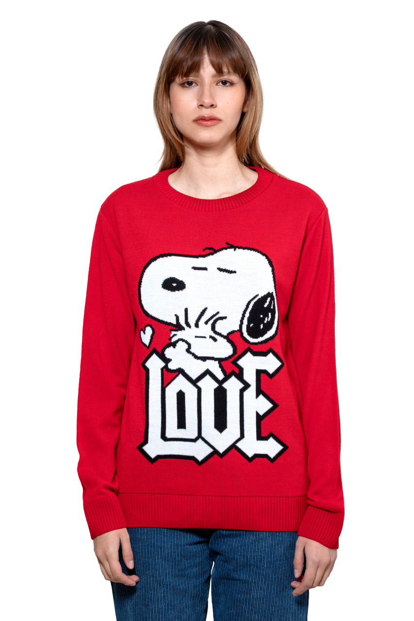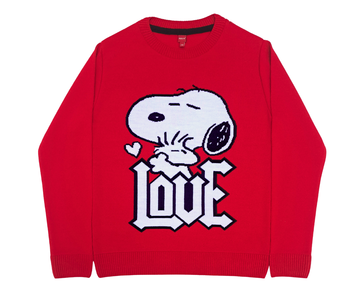 Este suéter destaca por su icónico y colorido gráfico tejido de Snoopy, con la palabra "LOVE" en primer plano, que añade un toque de diversión y nostalgia a cualquier atuendo.