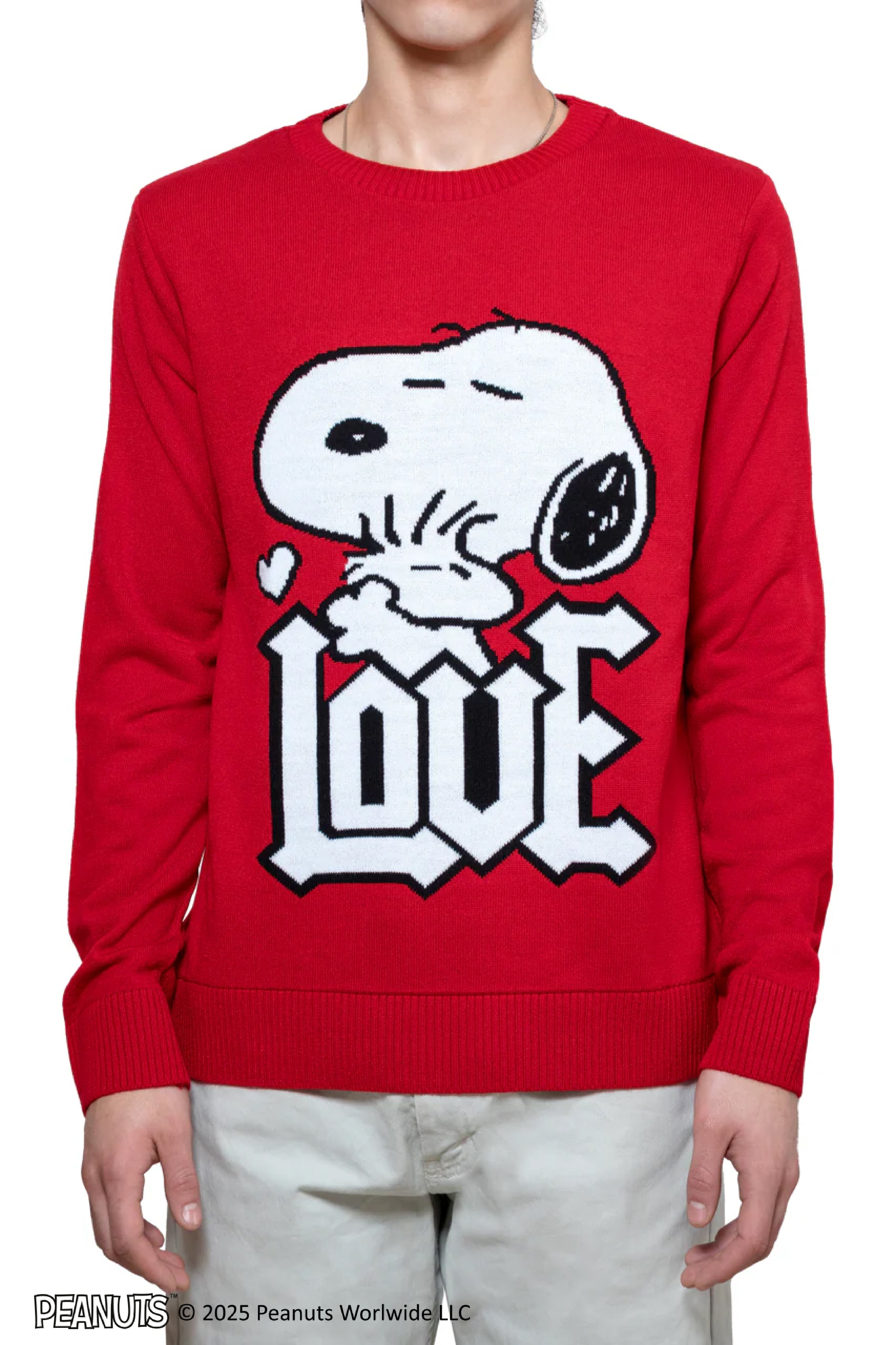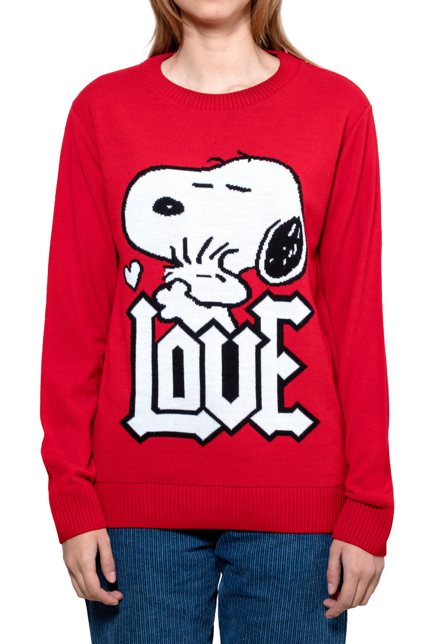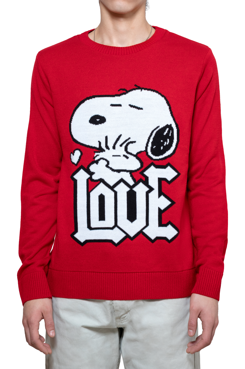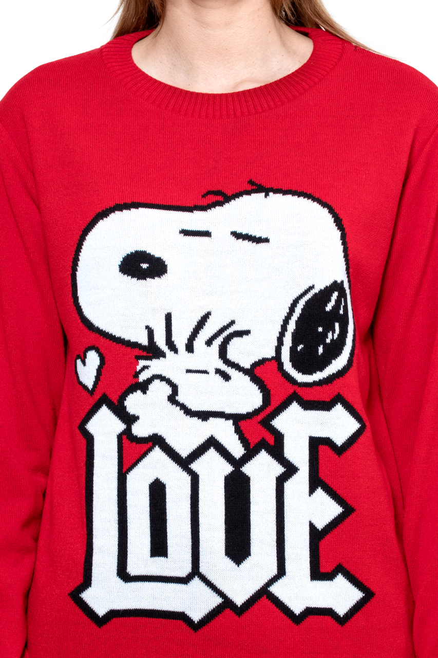 Este suéter destaca por su icónico y colorido gráfico tejido de Snoopy, con la palabra "LOVE" en primer plano, que añade un toque de diversión y nostalgia a cualquier atuendo.