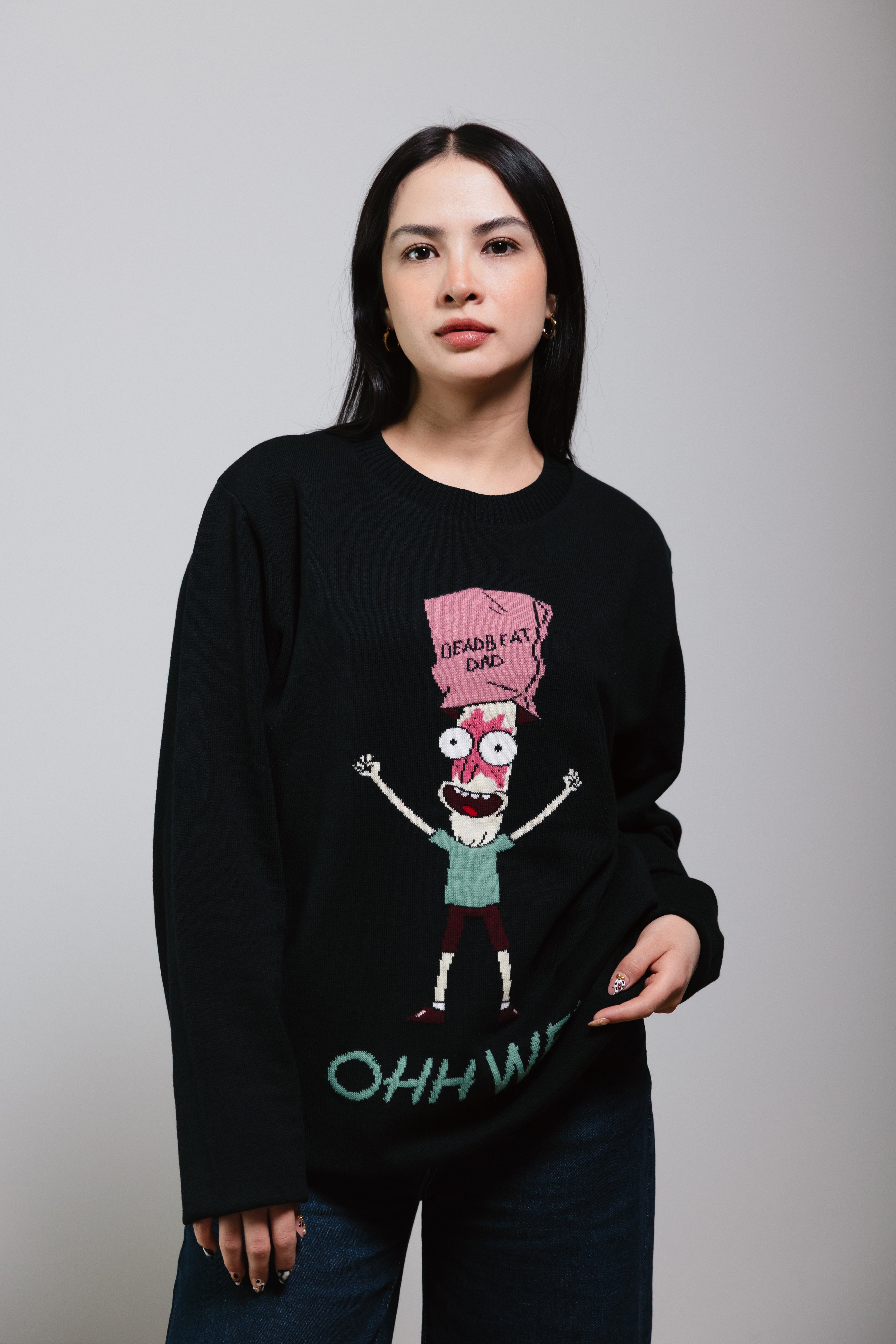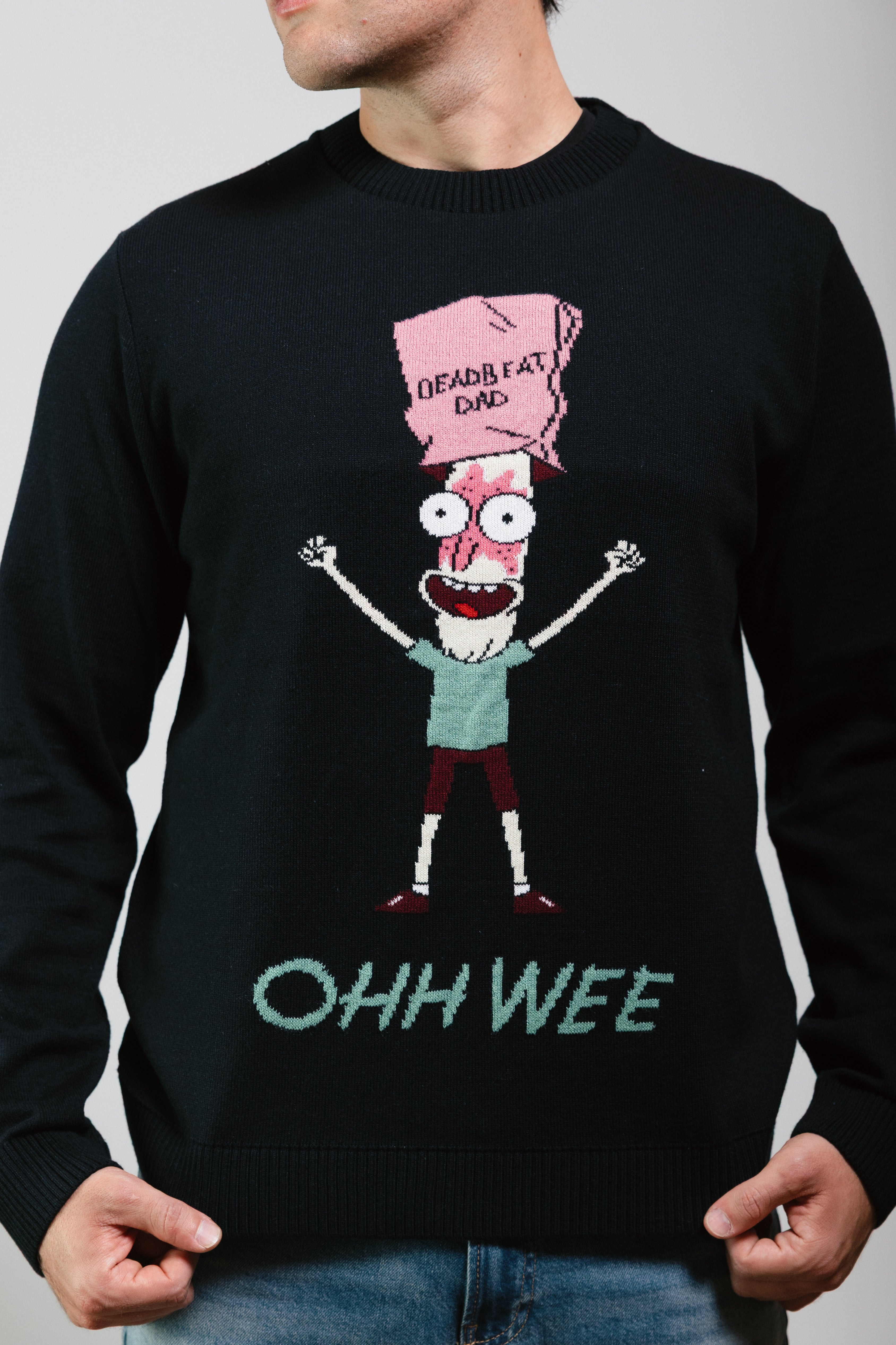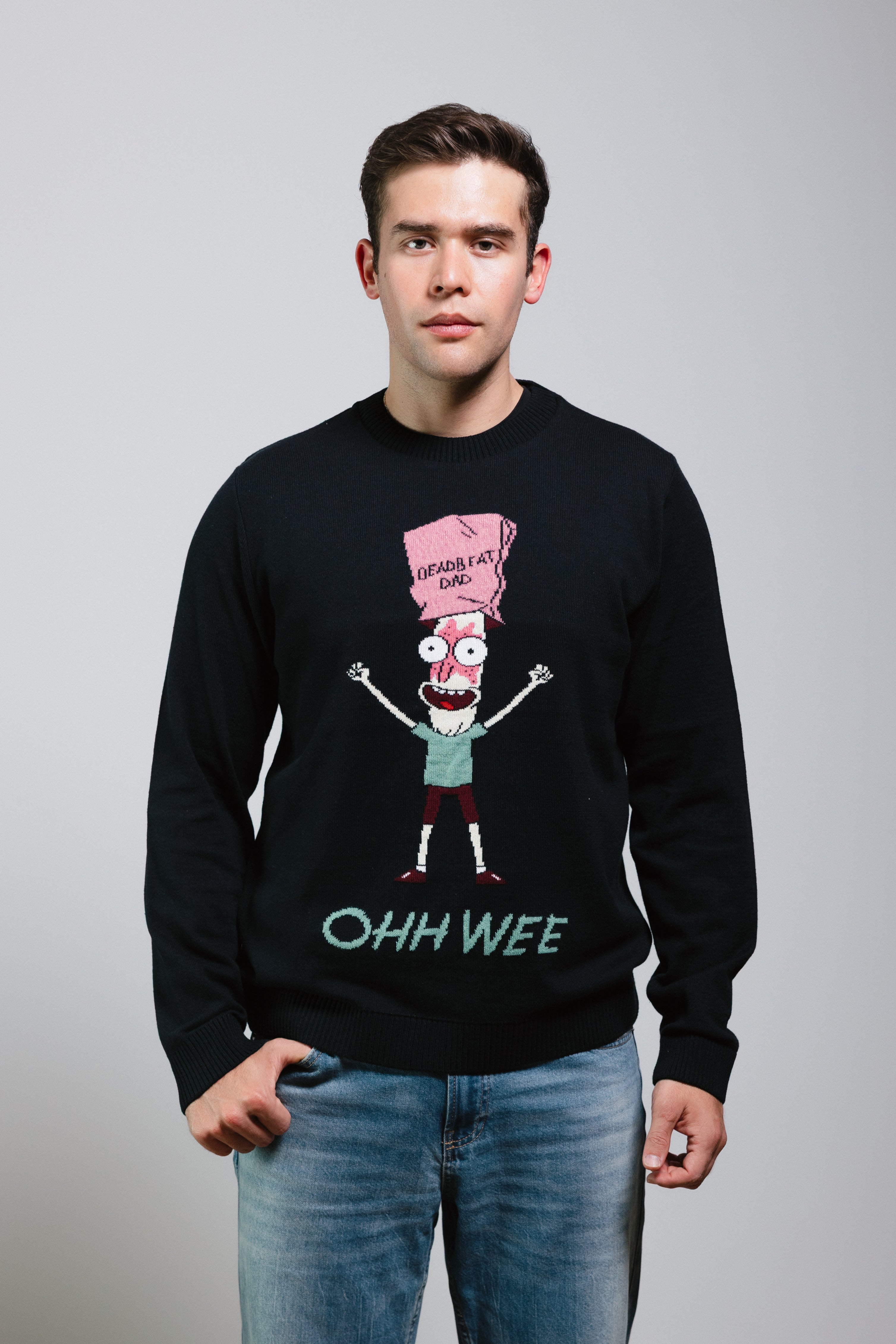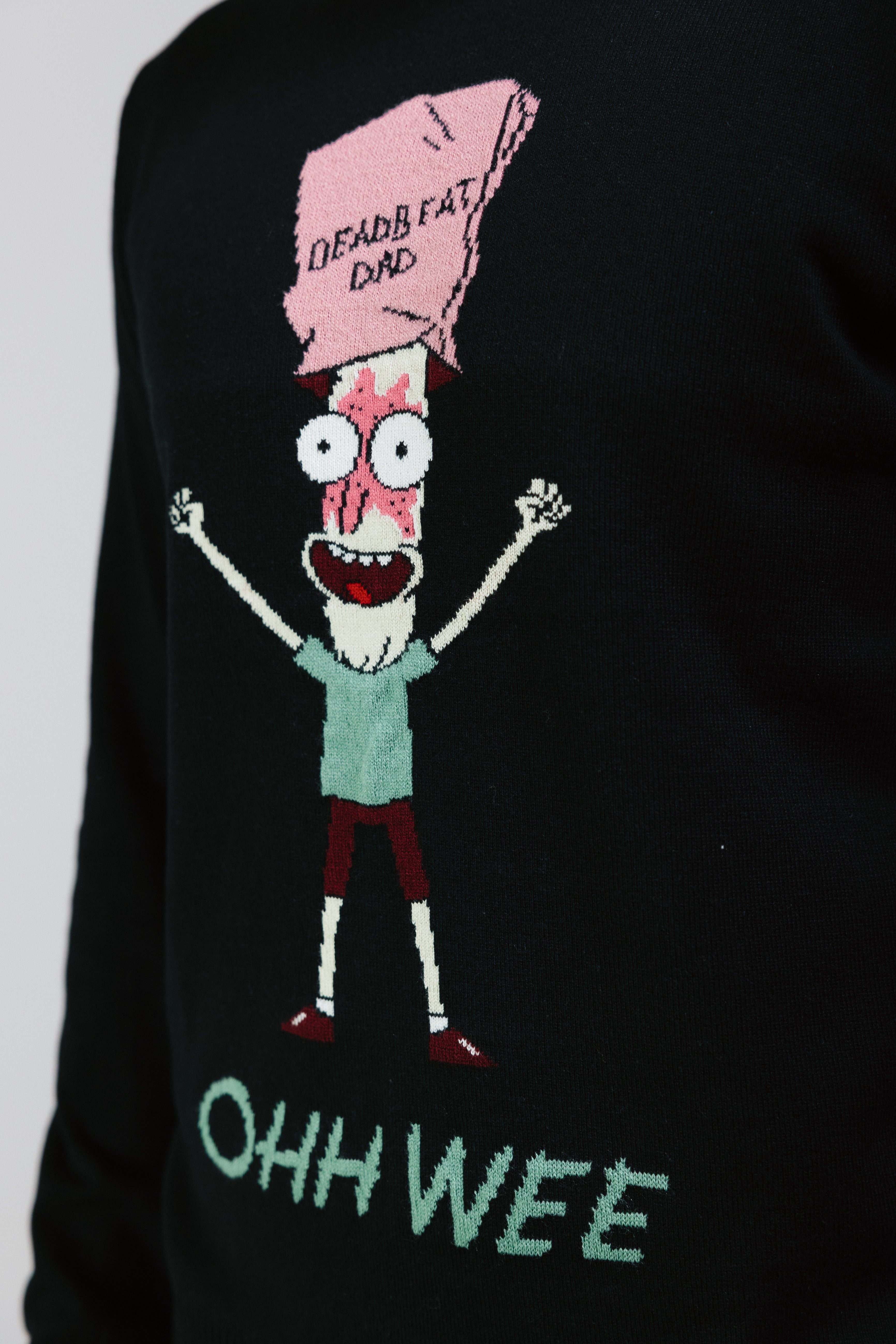 El modelo destaca por su color negro sólido, que sirve como el fondo perfecto para el gráfico central: una ilustración detallada y colorida del personaje Mr. Poopybutthole, con los brazos en alto y una expresión de angustia. Sobre su cabeza, lleva una bolsa de papel rosa con las palabras en negro, "DEADBEAT DAD". En la parte inferior, resalta la famosa frase de Mr. Poopybutthole, "OHH WEE", en un hilo verde claro, lo que le otorga una estética retro que parece salida directamente de uno de los inventos de Rick Sanchez.